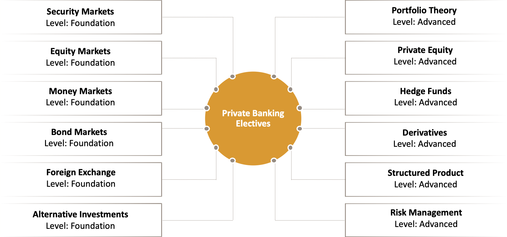 Once you have passed the final test of the Essentials course, you will be eligible for any of the 12 Private Banking Elective courses. The Electives address a topic in more depth. Pick the topics of interest to you. We recommend starting with the Essentials Foundation level topics before moving on to the Advanced level topics.