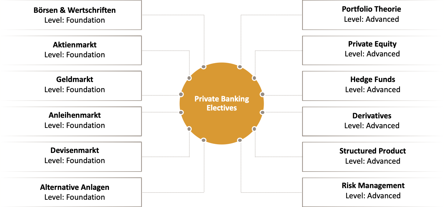 Bitte beginne mit dem Private Banking Essential Kurs und fahre anschliessend mit den Private Banking Elective Kursen fort.